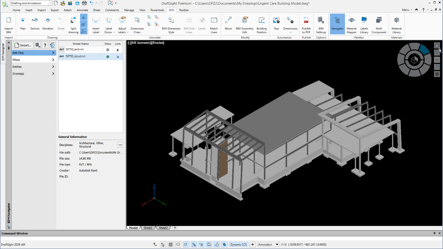 Easily open 3D BIM models with the new BIM Module that enables you to integrate BIM workflows into DWG-based design processes enabling you to generate 2D drawings by importing and leveraging data from 3D BIM model files. For instance, you can create floor plans, sections, and elevations from a BIM model such as RVT and IFC files.