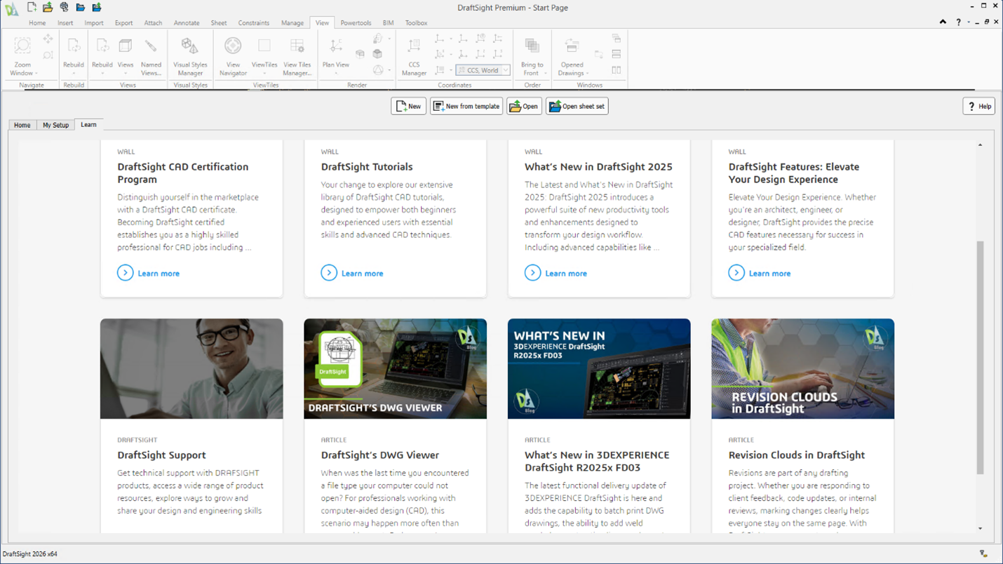The Start Page tab centralizes key operations and creates a smoother user experience when you open DraftSight, providing quick access to frequently used functions in one location.
